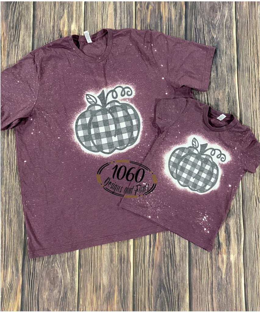 Plaid pumpkin Fall bleached adult and youth tees. Made with Bella Canvas brand unisex tees poly/cotton blend tees in heather maroon. Size charts are in pictures.